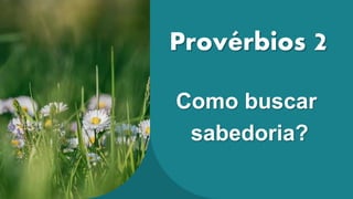 O capítulo 2 de Provérbios ensina sobre a importância da busca pela sabedoria, destacando que ela deve ser procurada com a mesma intensidade que se busca tesouros. O texto também enfatiza as bênçãos que a sabedoria traz, incluindo discernimento e proteção contra o mal. Além disso, orienta sobre a pureza e os caminhos dos justos, reafirmando que o Senhor é a fonte de sabedoria.