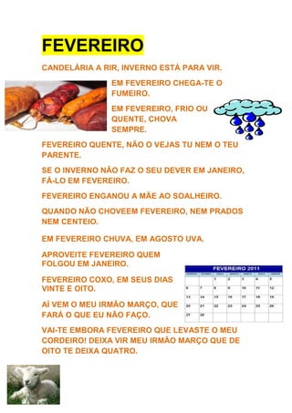 Este documento contém provérbios populares portugueses sobre os meses de janeiro, fevereiro e março. Os provérbios fornecem conselhos e previsões sobre o clima, as estações do ano e as atividades agrícolas típicas de cada mês.