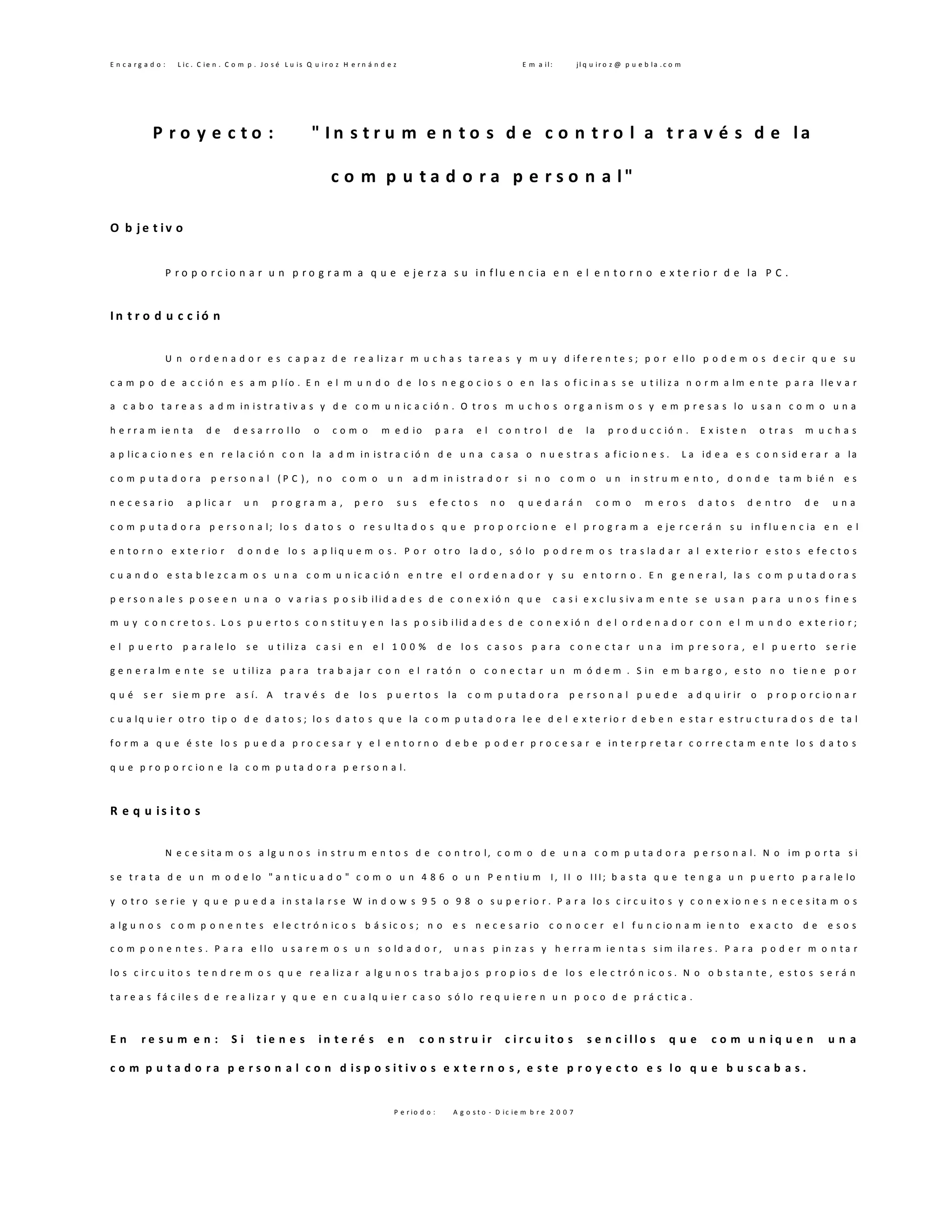 O documento apresenta um projeto para desenvolver instrumentos de controle através de computadores pessoais, visando sua aplicação em áreas administrativas e de comunicação. Destaca a importância da conexão entre o computador e o mundo externo, onde a eficácia depende de um programa que processe dados adequadamente. Finalmente, sugere que o projeto é adequado para quem deseja criar circuitos simples que comuniquem informações de forma positiva entre um computador e dispositivos externos.