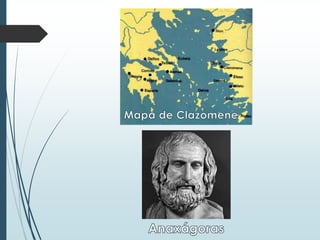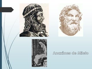 Este documento fornece um resumo dos principais filósofos pré-socráticos, incluindo Tales de Mileto, Anaximandro, Anaxímenes, Pitágoras, Heráclito, Parmênides, Empédocles, Anaxágoras, Demócrito. Os filósofos pré-socráticos procuravam explicar a origem e a natureza do universo através de ideias como água, ar, números e átomos.