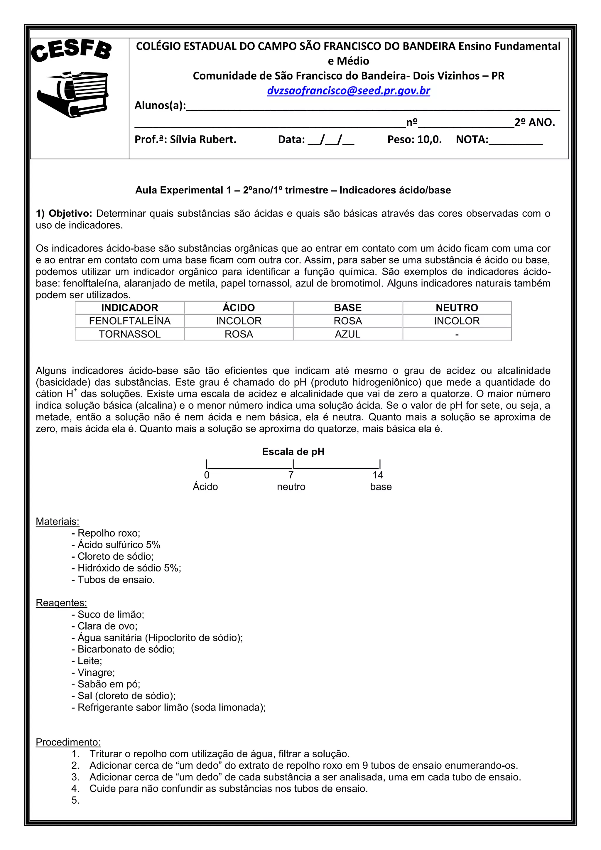 O documento descreve uma aula experimental sobre indicadores ácido-base para alunos do 2º ano. O objetivo é determinar quais substâncias são ácidas ou básicas usando indicadores orgânicos e a escala de pH. O procedimento inclui o uso de repolho roxo como indicador natural para observar as mudanças de cor com diferentes substâncias.