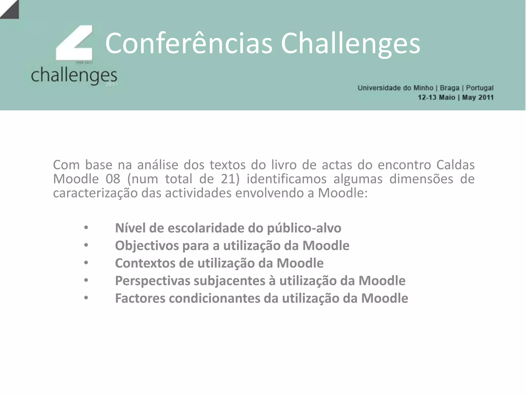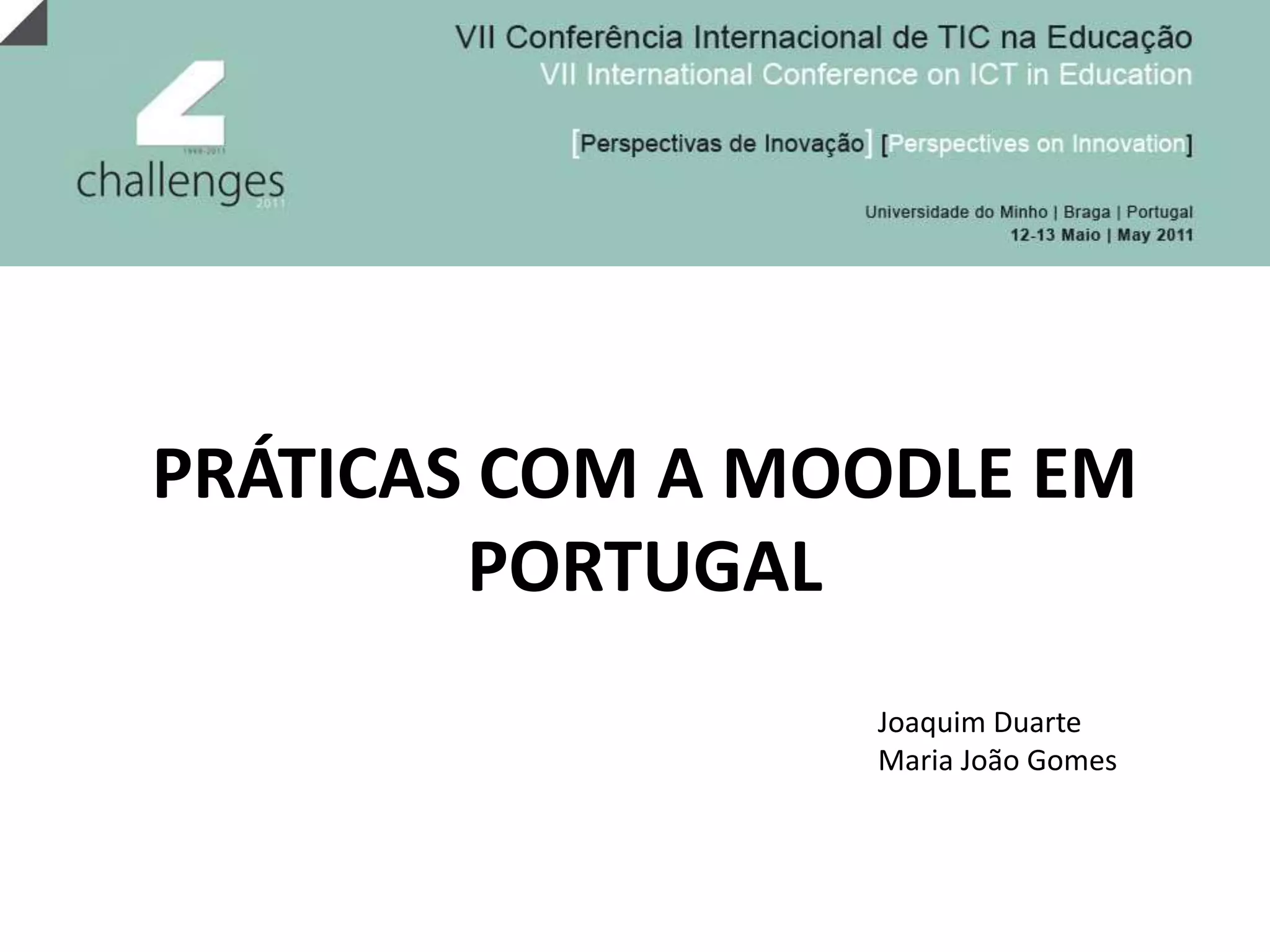 O documento analisa a utilização da plataforma Moodle em Portugal, destacando suas diversas aplicações nos níveis de escolaridade e a formação de professores. Identifica objetivos como a promoção de comunidades de aprendizagem e a inovação pedagógica, além de explorar os contextos de uso e fatores que condicionam essa utilização. Conclui levantando questões sobre a influência do uso crescente da plataforma por professores do ensino superior e sua contribuição para o conhecimento sobre o Moodle no país.