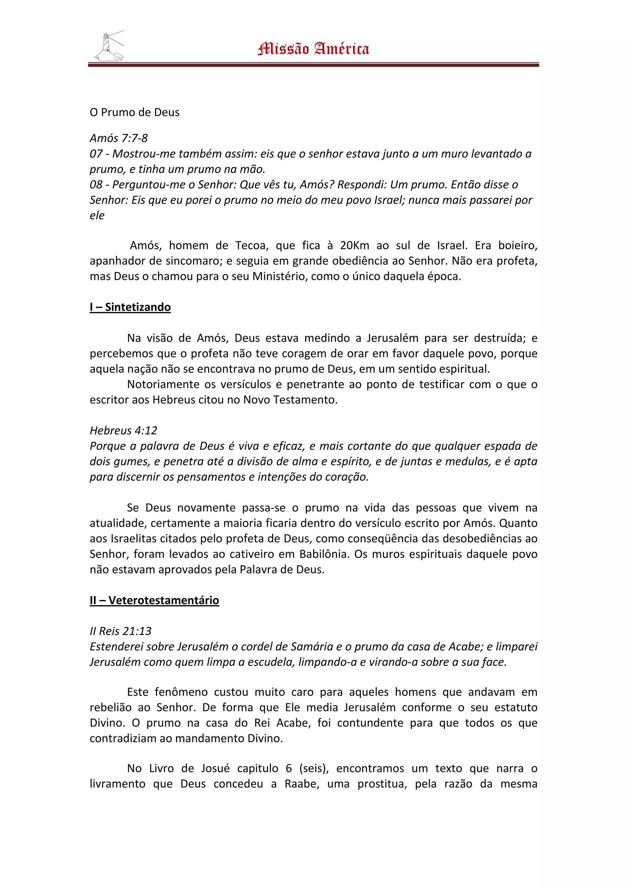O documento discute como Deus usa um "prumo" para medir se as pessoas e nações estão alinhadas com Sua vontade. Ele cita exemplos bíblicos de como Israel e Jerusalém foram medidos e achados desalinhados, levando a destruição. Também fala sobre como Jesus é o verdadeiro "prumo" e aqueles que se alinham com Ele encontrarão salvação.