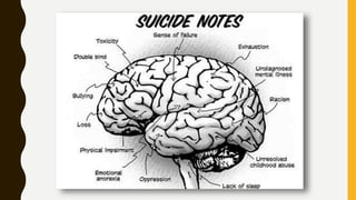 Este documento discute o suicídio, definindo-o como a privação voluntária da vida e identificando fatores de risco como transtornos mentais e traumas. Ele também distingue entre suicídio direto e indireto e discute o tratamento para sentimentos suicidas com base na idade, história médica e gravidade dos sintomas do paciente. Por fim, apresenta um caso sobre um homem que considera o suicídio após a morte de sua esposa.