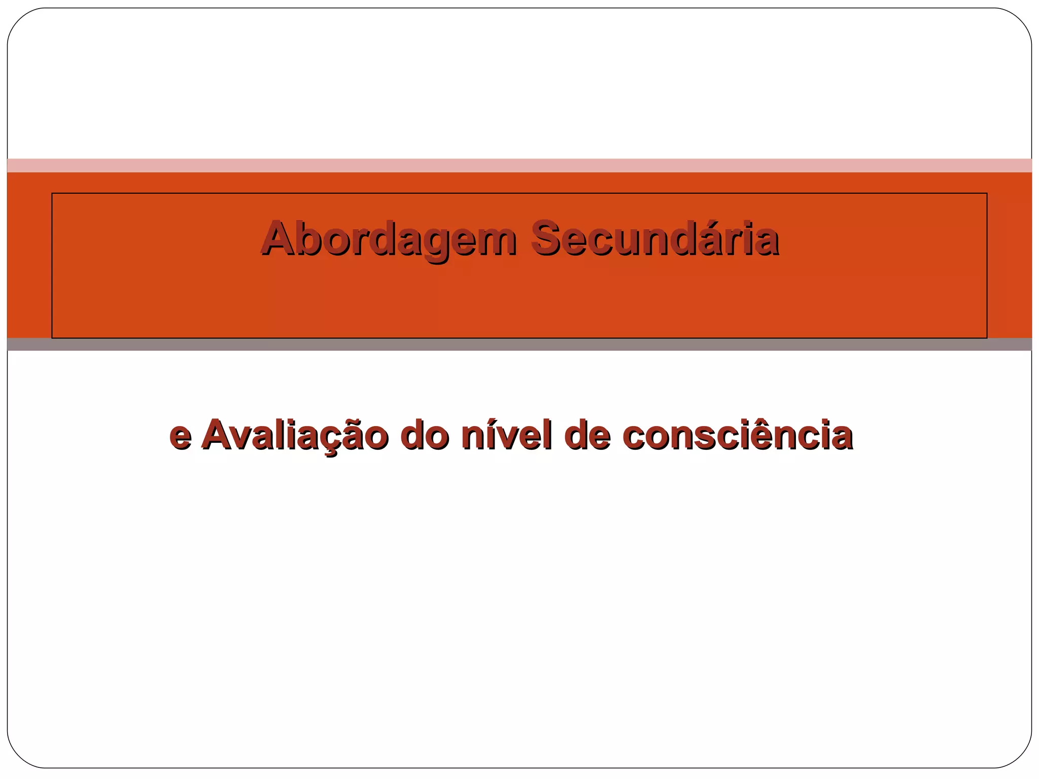 O documento descreve os procedimentos de abordagem secundária para avaliação de vítimas, incluindo exame segmentar detalhado de cada parte do corpo e uso da Escala de Glasgow para avaliar o nível de consciência. A abordagem secundária só deve ser iniciada após a abordagem primária e envolve inspecionar, palpar, auscultar cada região do corpo em busca de lesões. A Escala de Glasgow avalia abertura dos olhos, resposta verbal e motora para pontuar o estado de consciência.