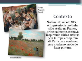 O documento descreve o movimento pós-impressionista, que surgiu no final do século XIX como uma reação ao impressionismo. Artistas como Van Gogh, Gauguin e Cézanne desenvolveram estilos individuais que influenciaram movimentos posteriores, enquanto Seurat e Signac continuaram a explorar a relação entre cor e luz através do pontilhismo.