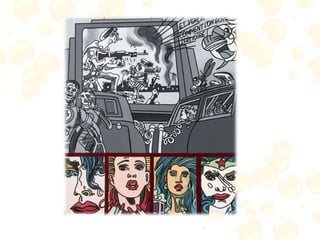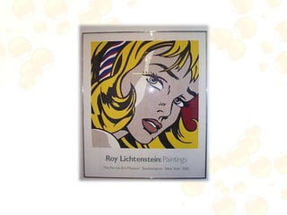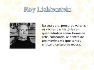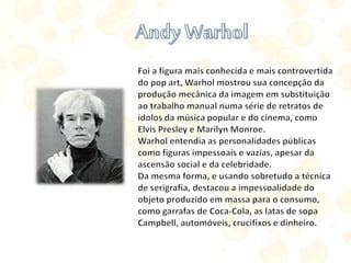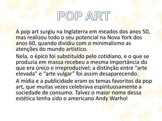 O documento descreve o surgimento e características da pop art, um movimento artístico que surgiu na Inglaterra na década de 1950 e se popularizou em Nova York na década de 1960. A pop art tomava como tema a cultura popular e a sociedade de consumo, celebrando objetos cotidianos e ícones da mídia. Andy Warhol foi um dos principais nomes desse estilo.