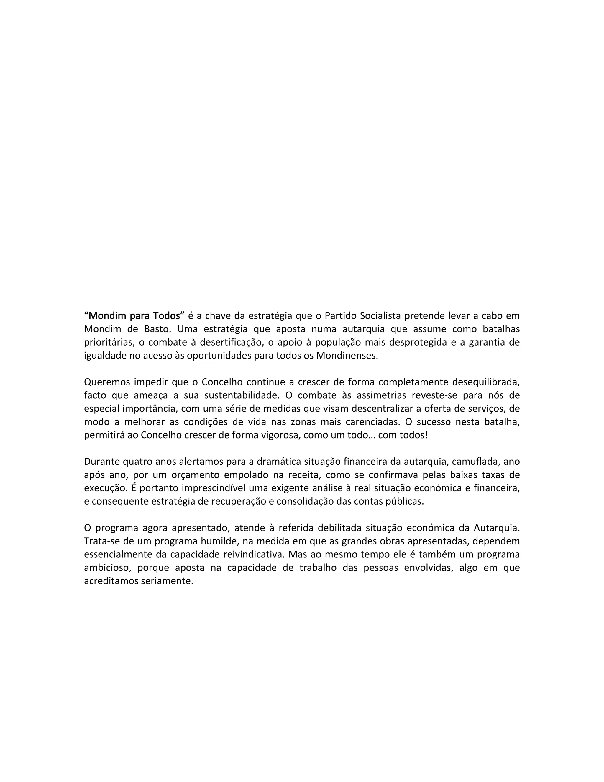 O documento descreve a estratégia do Partido Socialista para o município de Mondim de Basto, focando-se no combate à desertificação, apoio à população desprotegida e igualdade de oportunidades. A estratégia propõe medidas para promover o emprego através do apoio à indústria, comércio e agricultura locais, assim como o desenvolvimento do turismo sustentável, aproveitando os recursos naturais da região.