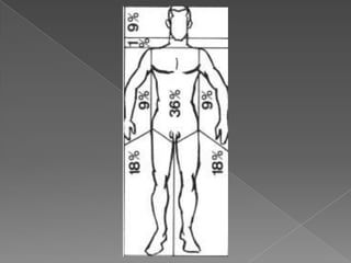 Queimaduras são lesões térmicas causadas por agentes físicos ou químicos na pele, classificadas de acordo com a profundidade e extensão da lesão, sendo maior a gravidade quanto maior a área e profundidade atingidas. Podem ser de primeiro grau com vermelhidão, segundo grau com bolhas e dor, ou terceiro grau afetando camadas profundas sem dor.