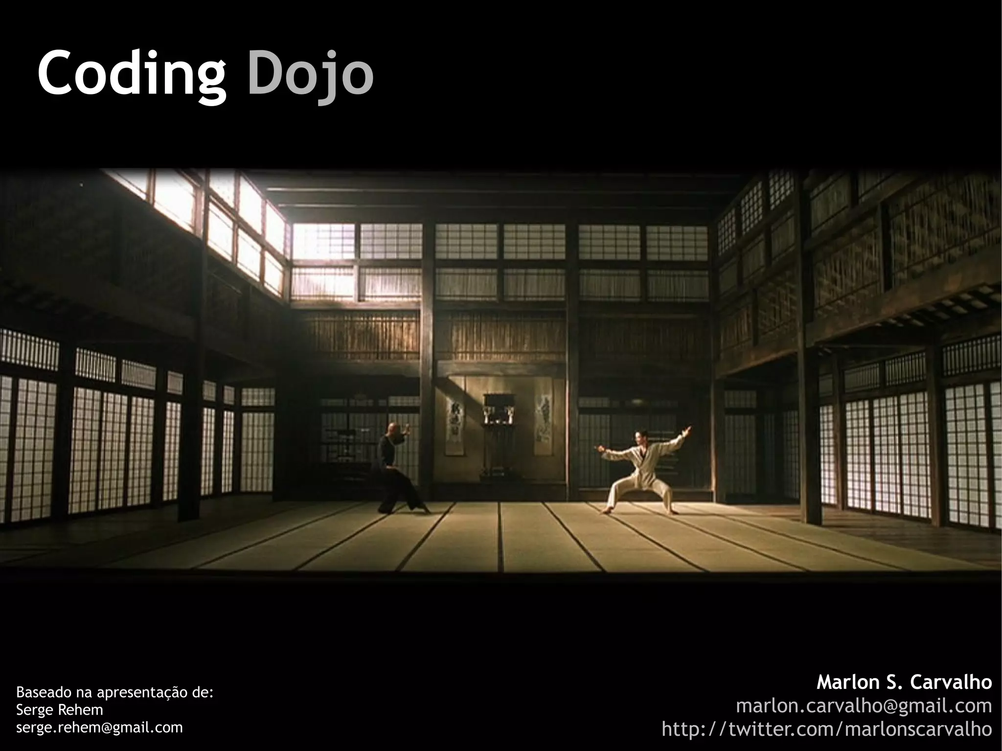 O documento descreve o Coding Dojo, que é uma reunião de programadores para treinar e aprender trabalhando juntos em desafios. O ambiente do Coding Dojo promove o aprendizado em pares e técnicas como programação em pares, teste dirigido a desenvolvimento e retrospectivas para melhoria contínua.