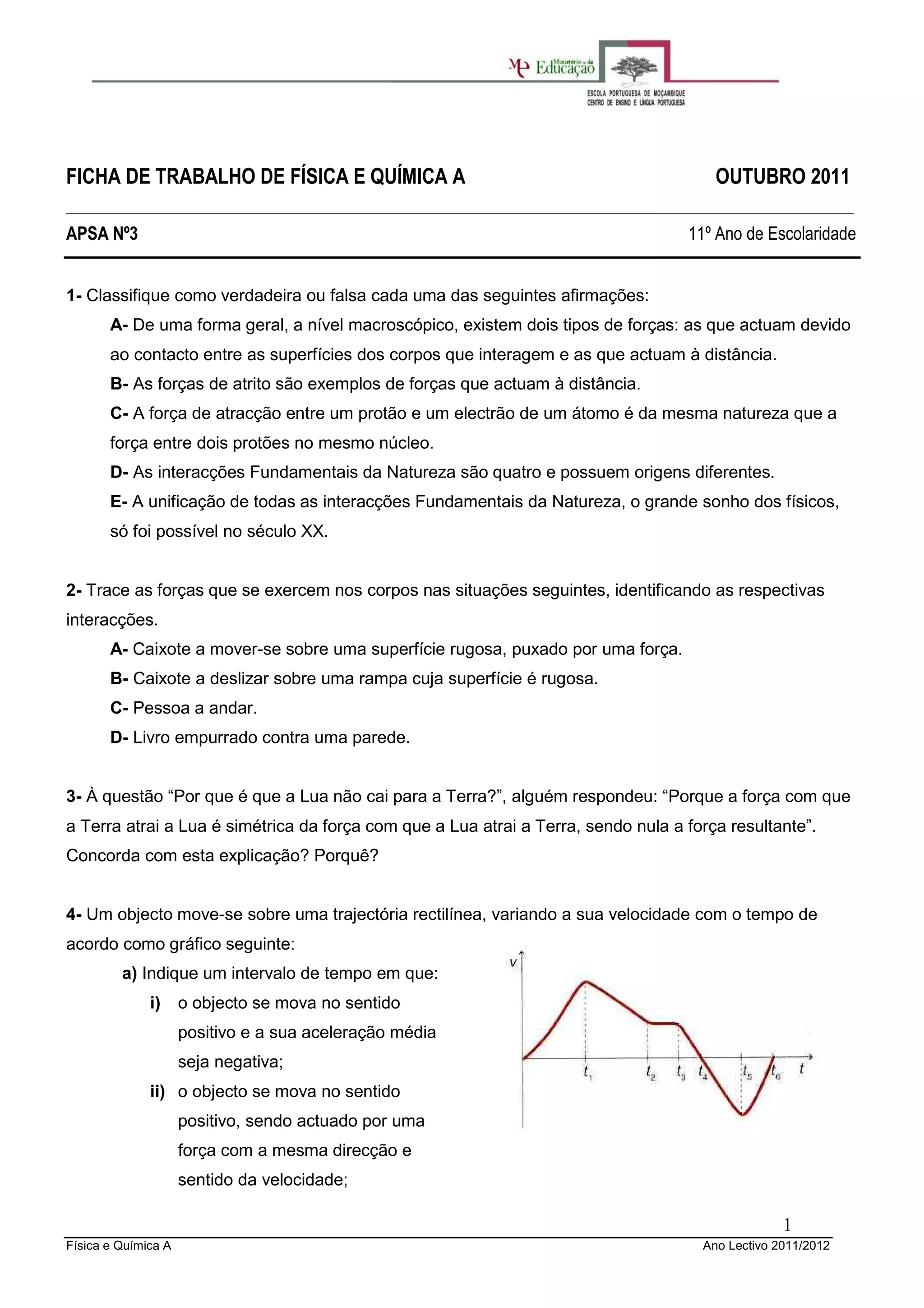 Este documento apresenta 9 questões sobre forças e movimento para uma prova de Física e Química do 11o ano. As questões abordam tópicos como forças de atrito, leis de Newton, gravitação e órbitas. Os alunos devem identificar afirmações verdadeiras ou falsas, traçar forças em diferentes situações, explicar o movimento da Lua, analisar gráficos de velocidade-tempo e escolher a opção correta para completar afirmações.