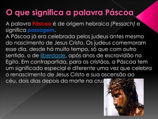O documento discute a origem e significado da Páscoa para judeus e cristãos. Para os judeus, a Páscoa comemora a libertação da escravidão no Egito, enquanto para os cristãos celebra a ressurreição de Jesus Cristo. O documento também explica os símbolos da Páscoa como ovos e coelhos.