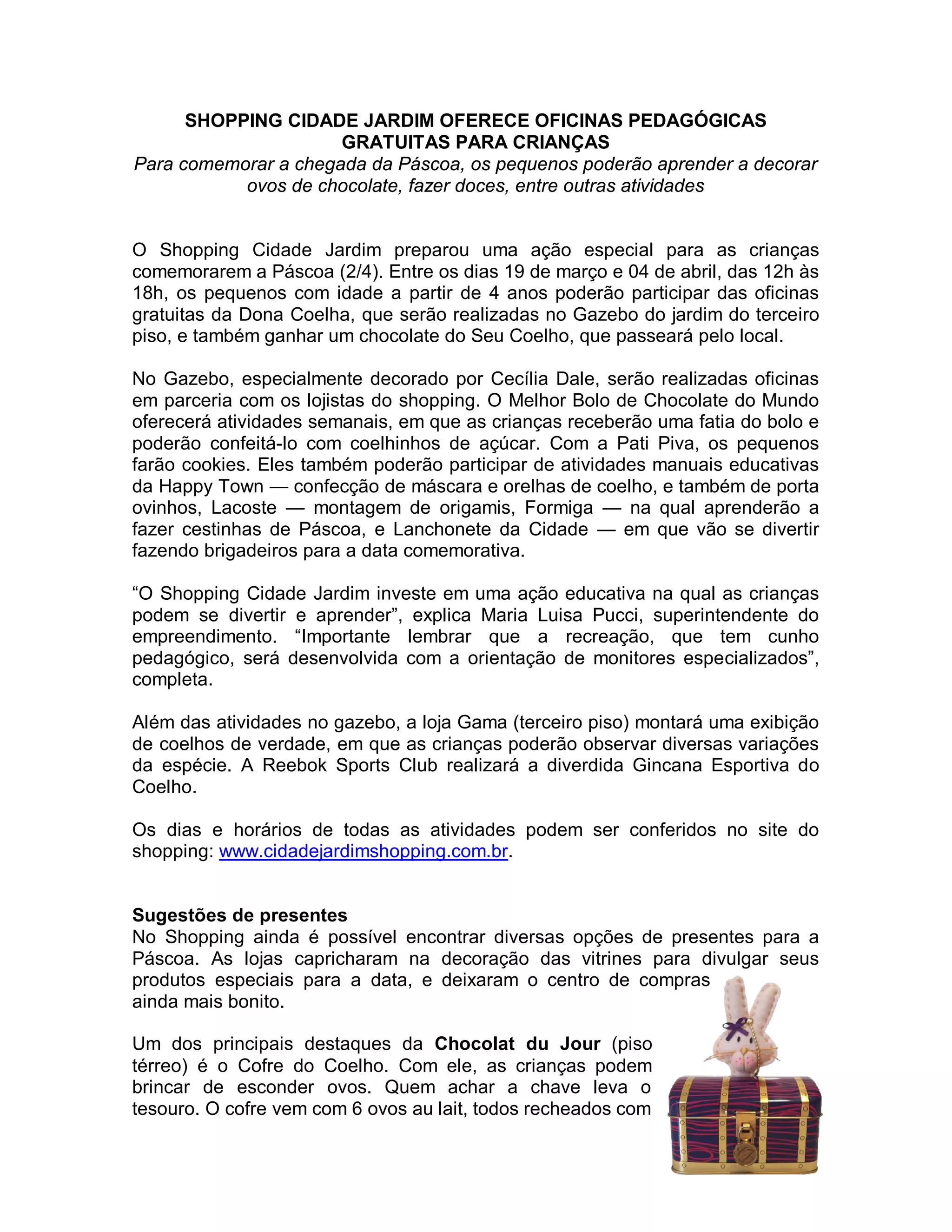 O Shopping Cidade Jardim oferecerá oficinas pedagógicas gratuitas para crianças entre os dias 19 de março e 04 de abril, incluindo atividades como decoração de ovos de chocolate e confeitar doces. As crianças também poderão observar coelhos de verdade e participar de uma gincana esportiva. Lojas do shopping oferecerão produtos especiais para a Páscoa como cestas, ovos e bolos decorados.