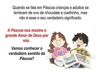 O documento explica o significado religioso da Páscoa, desde os eventos no Antigo Testamento até a crucificação e ressurreição de Jesus Cristo. Relembra os últimos dias de Jesus, incluindo a Última Ceia, a prisão, crucificação e ressurreição no terceiro dia.