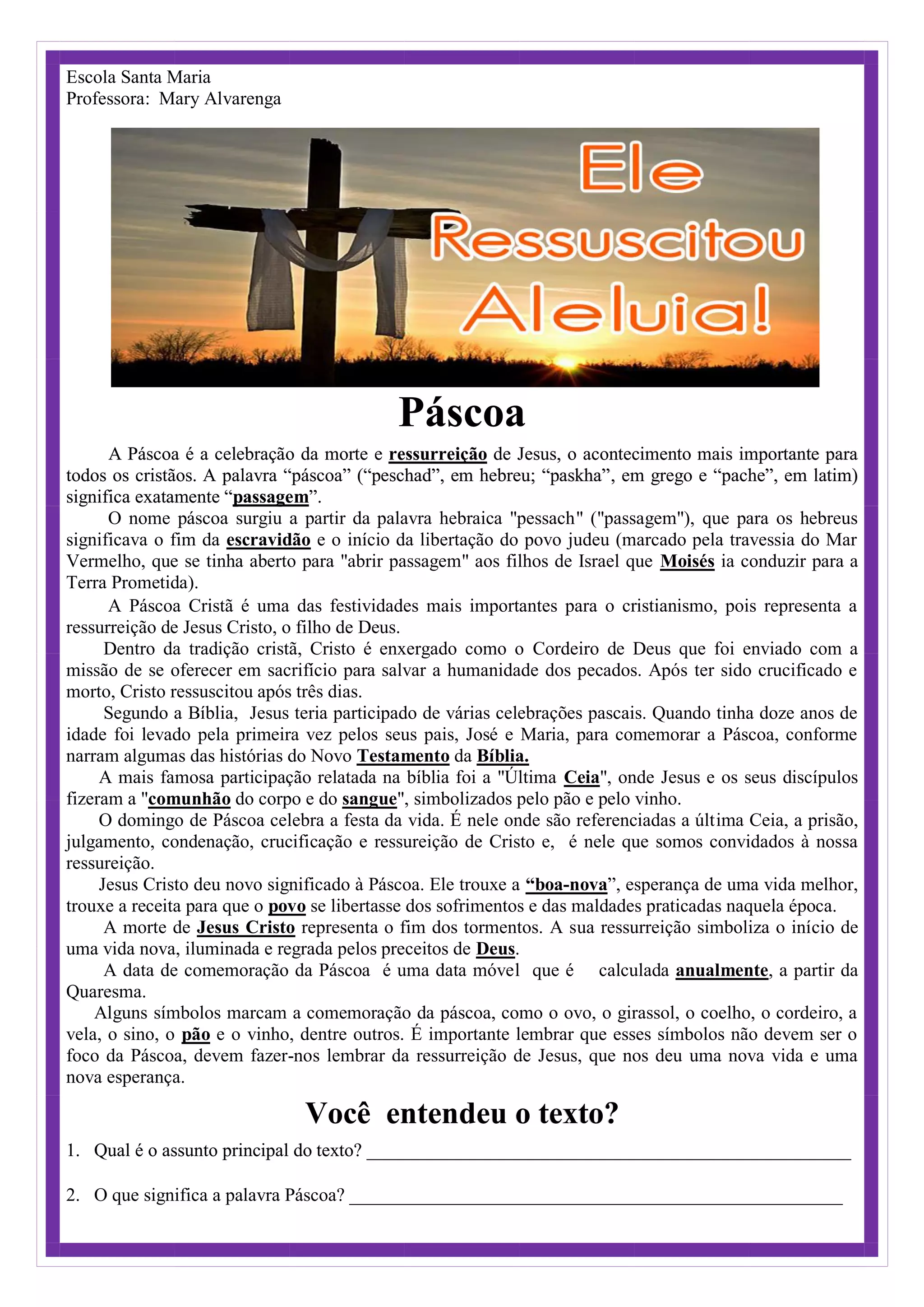 O texto descreve a Páscoa como a celebração da morte e ressurreição de Jesus Cristo, evento mais importante para os cristãos. Explica que a palavra Páscoa significa "passagem" e tem origem no termo hebraico para a libertação do povo judeu. A Páscoa cristã representa a ressurreição de Cristo após ter sido crucificado.