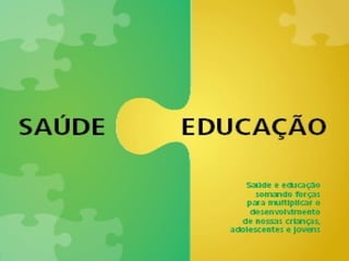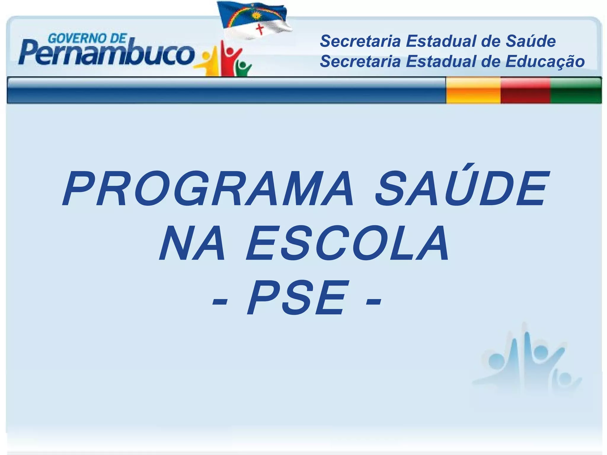 O documento descreve o Programa Saúde na Escola (PSE) no estado de Pernambuco, que tem como objetivos integrar ações de saúde e educação, promover a saúde de estudantes e capacitar profissionais. O PSE realiza avaliações de saúde, promoção da saúde, monitoramento dos estudantes e educação continuada de educadores.