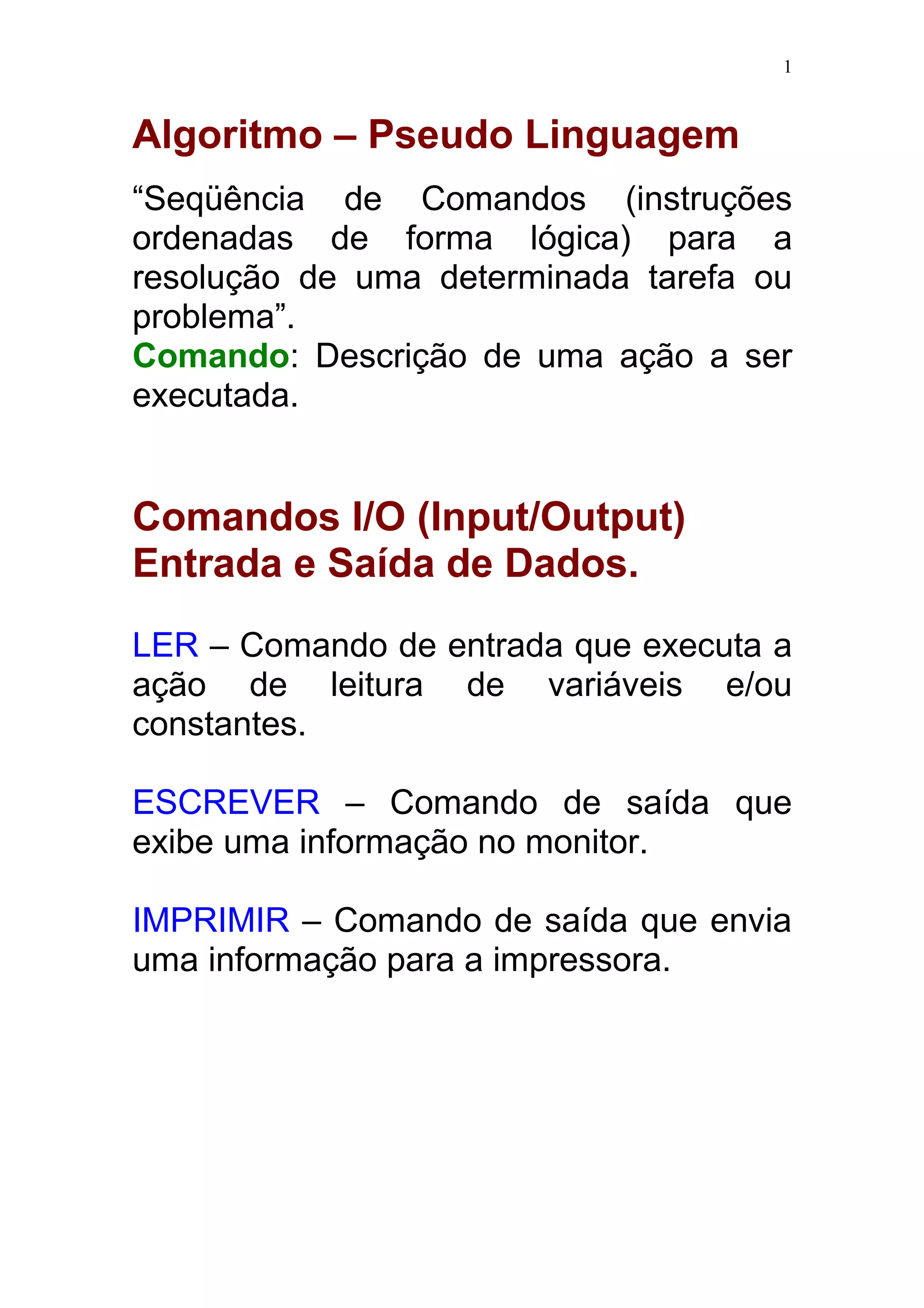 O documento descreve os principais elementos de um algoritmo em pseudocódigo, incluindo comandos de entrada e saída, variáveis e constantes, operadores aritméticos e relacionais, estruturas de repetição e tomada de decisão. É apresentado um exemplo de algoritmo para comparar dois valores numéricos.