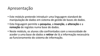 O documento apresenta a linguagem SQL como linguagem padrão para manipulação de dados em sistemas de gestão de bases de dados. Aborda conceitos como pesquisas simples e complexas utilizando comandos como SELECT, WHERE, LIKE, BETWEEN, IN, DISTINCT, ORDER BY e cláusulas lógicas. O objetivo é introduzir os alunos à necessidade de acessar e extrair informação de bases de dados usando SQL.