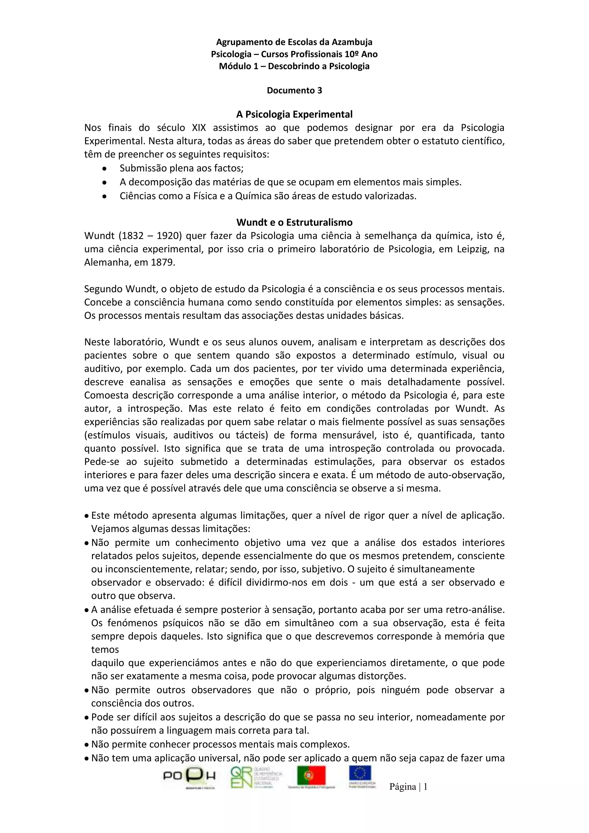 O documento descreve os principais desenvolvimentos da psicologia experimental no final do século XIX e início do século XX, incluindo o trabalho pioneiro de Wundt, Pavlov e Freud. Wundt estabeleceu o primeiro laboratório de psicologia e defendeu a introspeção controlada. Pavlov estudou o condicionamento clássico através de experiências com cães. Freud desenvolveu a psicanálise e introduziu o conceito do inconsciente.