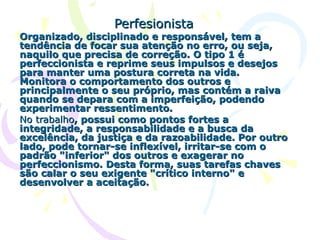 O documento descreve os principais tipos de personalidade de acordo com a psicologia: Perfeccionista, Dador, Desempenhador, Observador, Romântico, Cético, Epicurista, Patrão, Mediador. Cada tipo tem suas forças e desafios característicos no trabalho e na vida, e tarefas chaves para equilibrar seus traços.