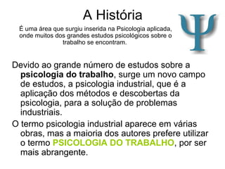 O documento discute a história e os campos de estudo da psicologia do trabalho, incluindo o estudo da relação entre o homem e o trabalho, o ambiente de trabalho, e as relações entre os componentes do trabalho. Aborda também as bases do comportamento humano, incluindo comportamento respondente e operante, e conceitos como personalidade, temperamento e atitude.