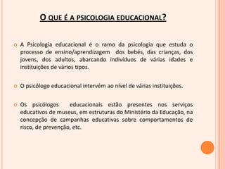 A psicologia educacional estuda o processo de ensino-aprendizagem em diferentes idades e instituições, analisando mecanismos de aprendizagem, estratégias educacionais e o funcionamento de instituições. Psicólogos educacionais atuam em escolas, museus e na concepção de campanhas, entre outros, focando no desenvolvimento de crianças e capacitação de adultos. A psicologia educacional difere da psicologia escolar em origem, formação e atuação.