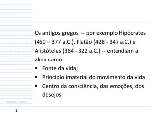 O documento discute a evolução histórica da psicologia como ciência, desde os antigos gregos que entendiam a alma como princípio da vida e consciência, até o estabelecimento da psicologia como ciência experimental por Wilhelm Wundt em 1879. Aborda conceitos como objeto, métodos e influências de Descartes e Aristóteles no desenvolvimento da psicologia moderna.