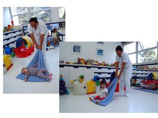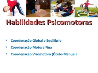 O documento discute o desenvolvimento das habilidades psicomotoras em diferentes faixas etárias, desde bebês até crianças de 6 anos. Aborda conceitos como coordenação global, equilíbrio e atividades recomendadas para estimular essas habilidades em cada fase.