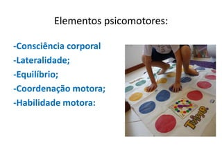 A psicomotricidade baseia-se na concepção da pessoa como um todo unificado que inclui interações cognitivas, sensoriomotoras e psíquicas. Ela utiliza o corpo e o movimento para favorecer a integração do sujeito consigo mesmo e com o mundo, abordando o ato motor humano. Os principais elementos psicomotores são a consciência corporal, a lateralidade, o equilíbrio, a coordenação motora e a habilidade motora.