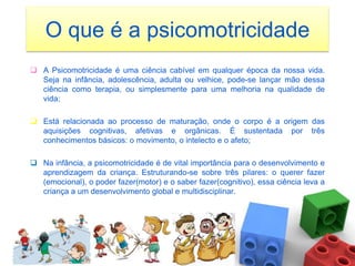 A psicomotricidade é uma ciência que estuda o desenvolvimento motor, intelectual e emocional da pessoa através do movimento. Ela é importante na infância para o desenvolvimento global da criança. Na educação infantil, atividades psicomotoras ajudam as crianças a se conhecerem melhor e se expressarem através do corpo. A educação física também contribui para a psicomotricidade ao promover o desenvolvimento de habilidades motoras.