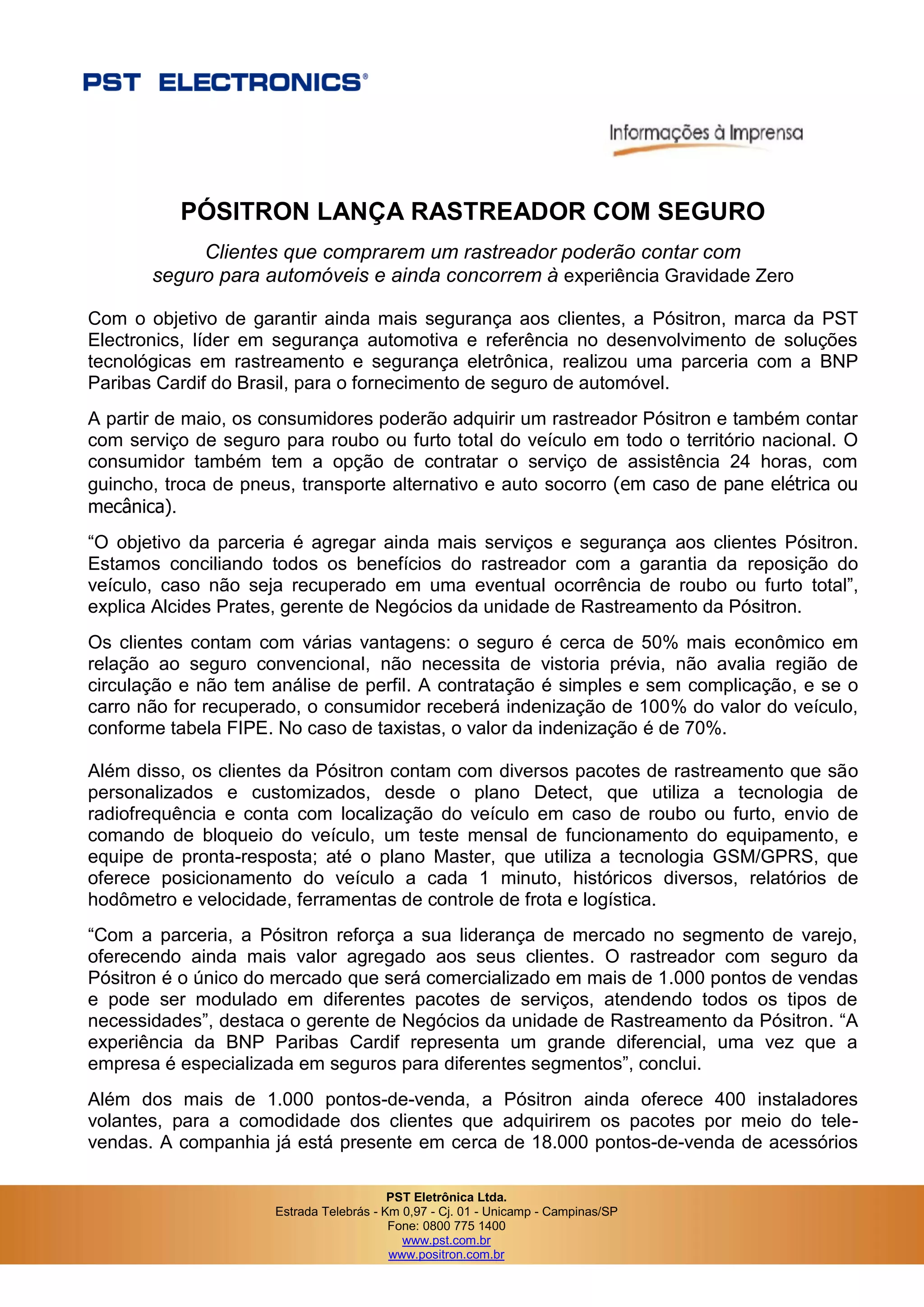 A Pósitron, líder em rastreamento e segurança eletrônica, lançou um rastreador com seguro de automóvel em parceria com a BNP Paribas Cardif. Os clientes que comprarem o rastreador terão seguro contra roubo/furto e concorrerão a uma experiência de gravidade zero nos EUA.