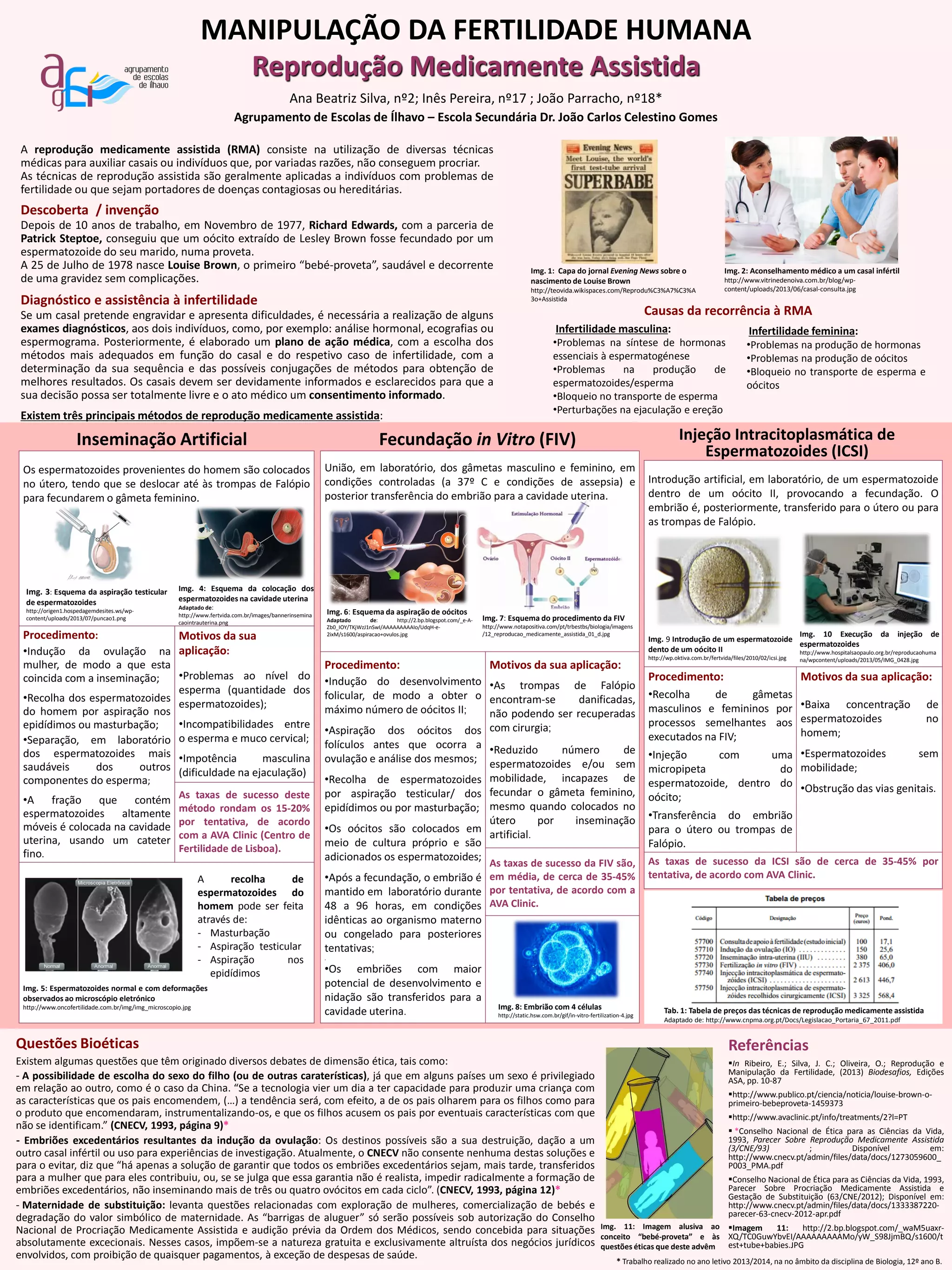 Este documento descreve as principais técnicas de reprodução medicamente assistida, incluindo a inseminação artificial, fecundação in vitro e injeção intracitoplasmática de espermatozoides. Discute as causas da infertilidade e fornece detalhes sobre os procedimentos envolvidos em cada técnica. Também aborda questões bioéticas relacionadas com a manipulação da fertilidade humana.