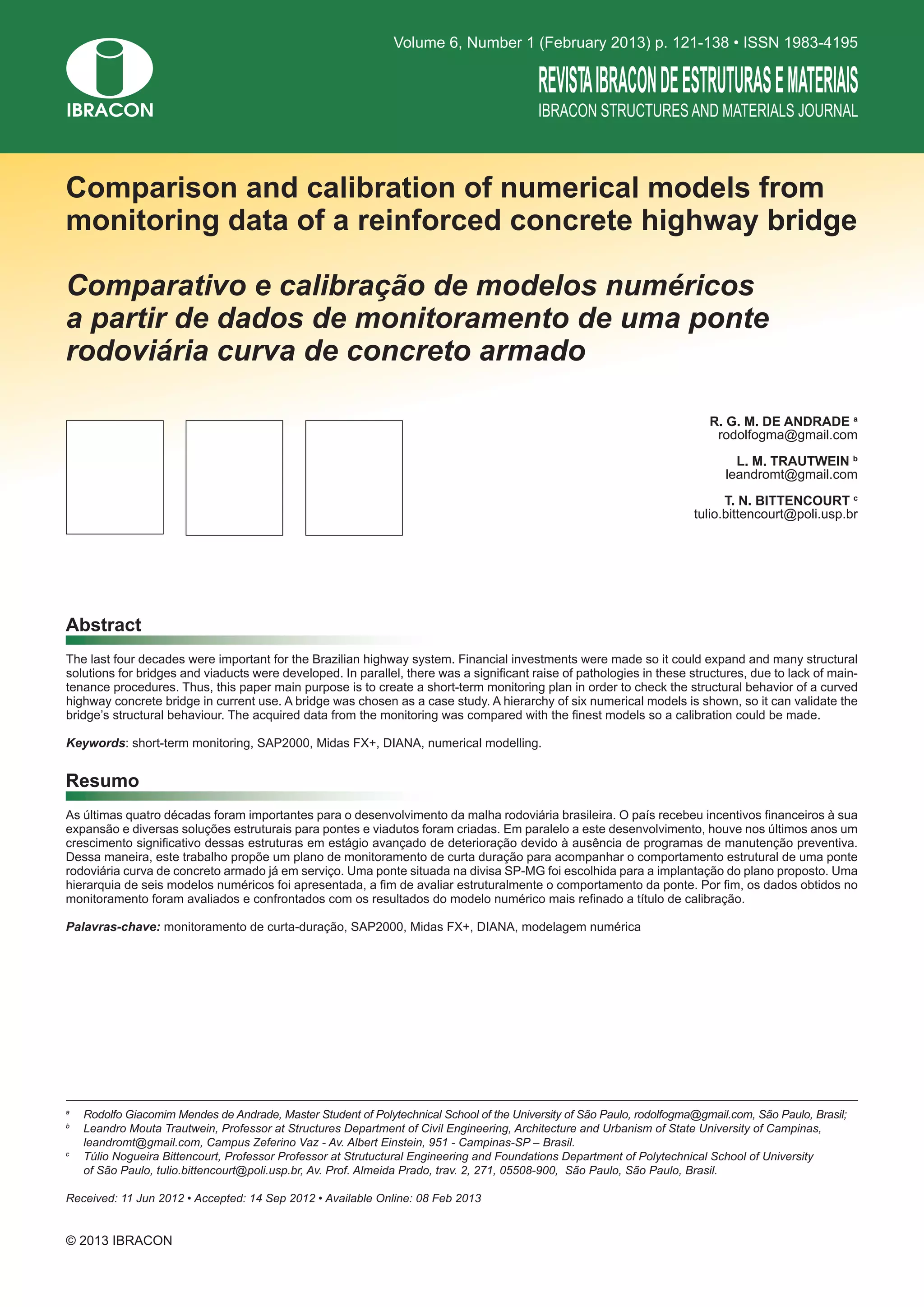 1) O documento descreve um plano de monitoramento de curta duração para uma ponte rodoviária curva de concreto armado no Brasil.