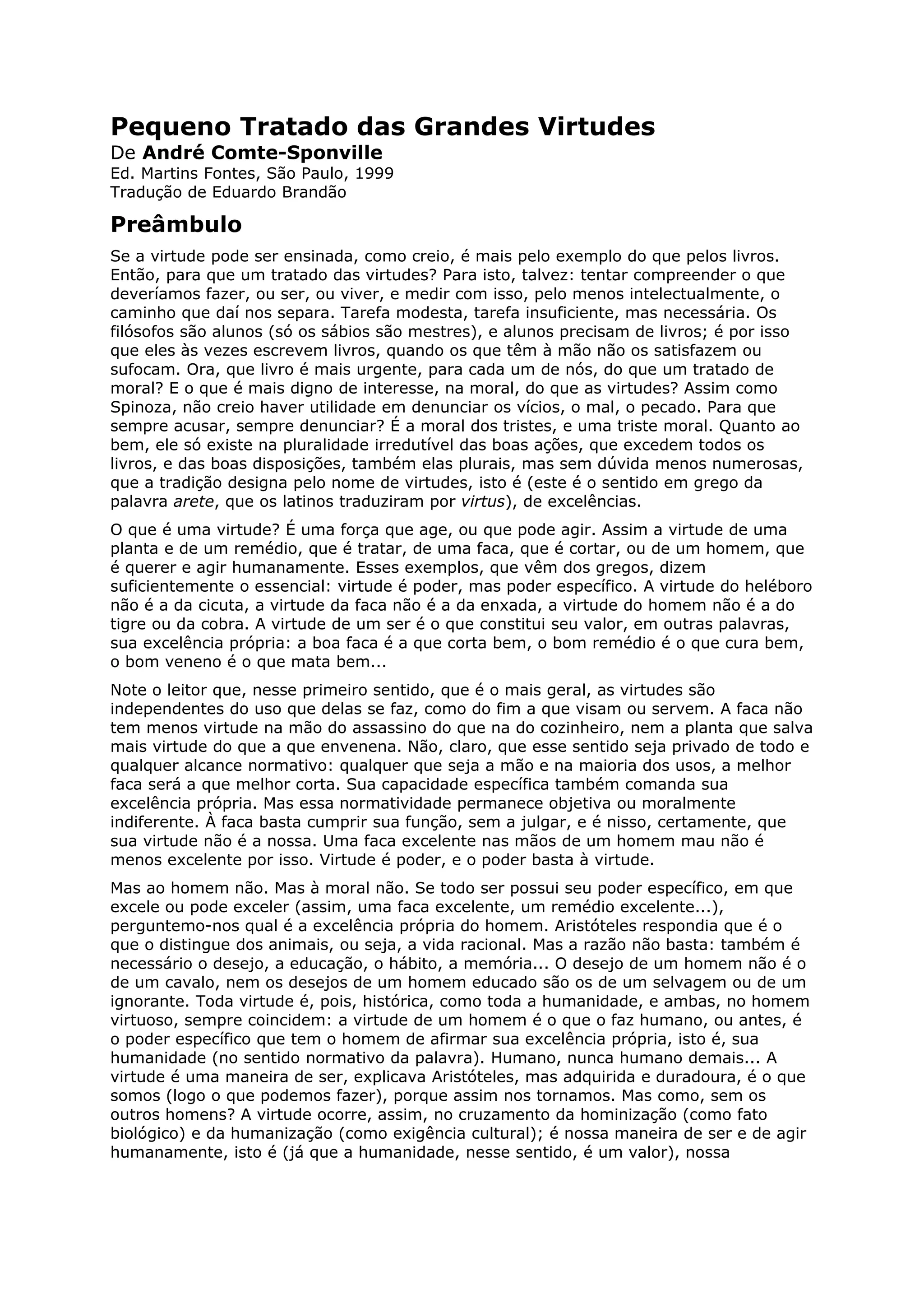 [1] O autor explica que o objetivo do livro é compreender o que deveríamos ser e fazer para medir o caminho que nos separa da virtude, embora reconheça que a reflexão não basta para tornar alguém virtuoso. [2] Ele define virtude como o poder específico de cada ser, no caso humano é o que nos torna humanos e nos capacita a agir bem. [3] O livro pretende ser prático, tratando dezoito virtudes como a polidez, justiça e amor de forma breve para o público em geral.