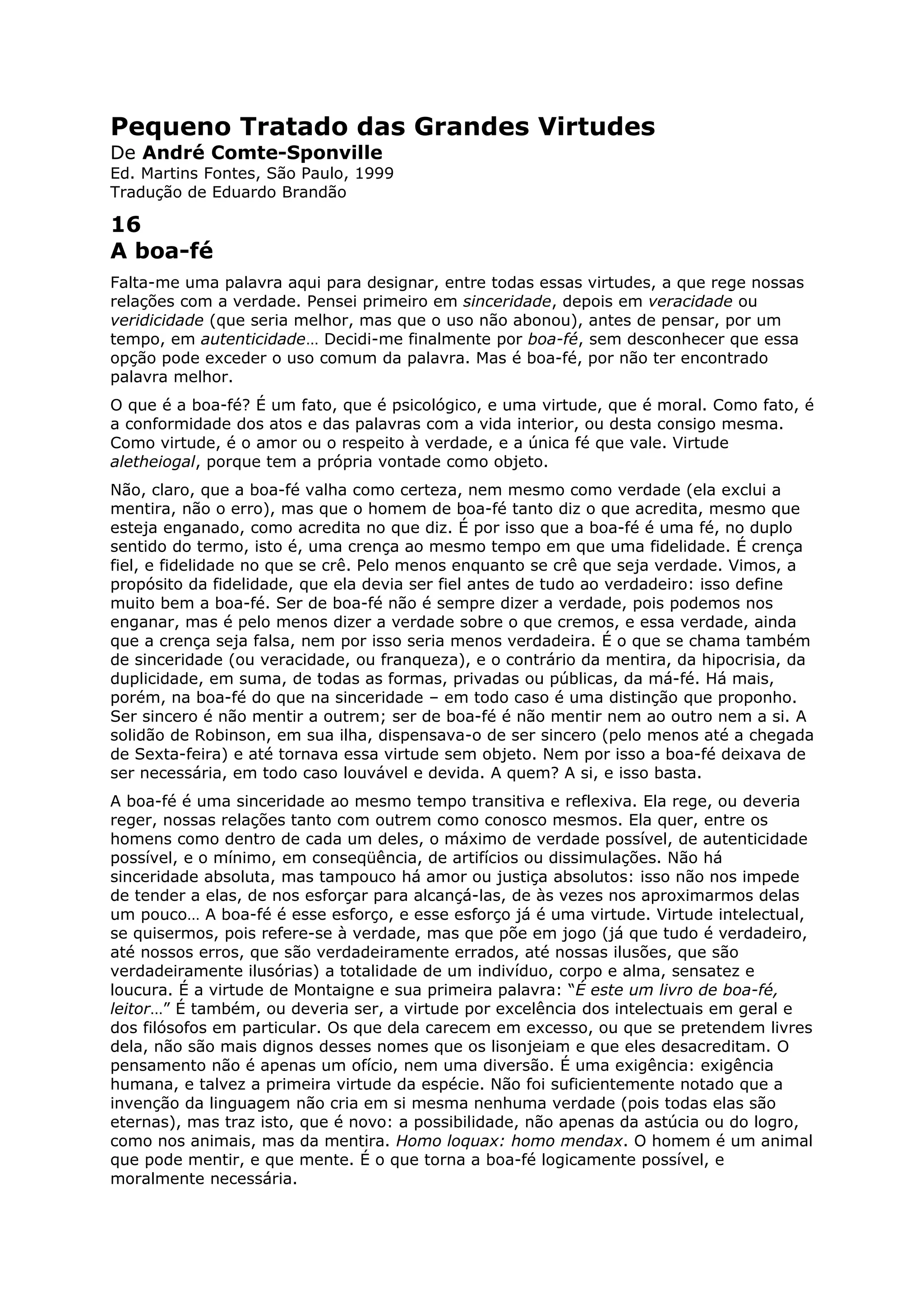 O documento discute a virtude da boa-fé, definida como a conformidade entre as ações, palavras e pensamentos de uma pessoa com a verdade interior dela. A boa-fé exige amor e respeito à verdade, evitando a mentira e a hipocrisia. Embora a sinceridade também seja importante, a boa-fé vai além ao exigir que uma pessoa não minta para si mesma. A boa-fé é essencial para que outras virtudes como justiça, generosidade e amor sejam verdadeiras.