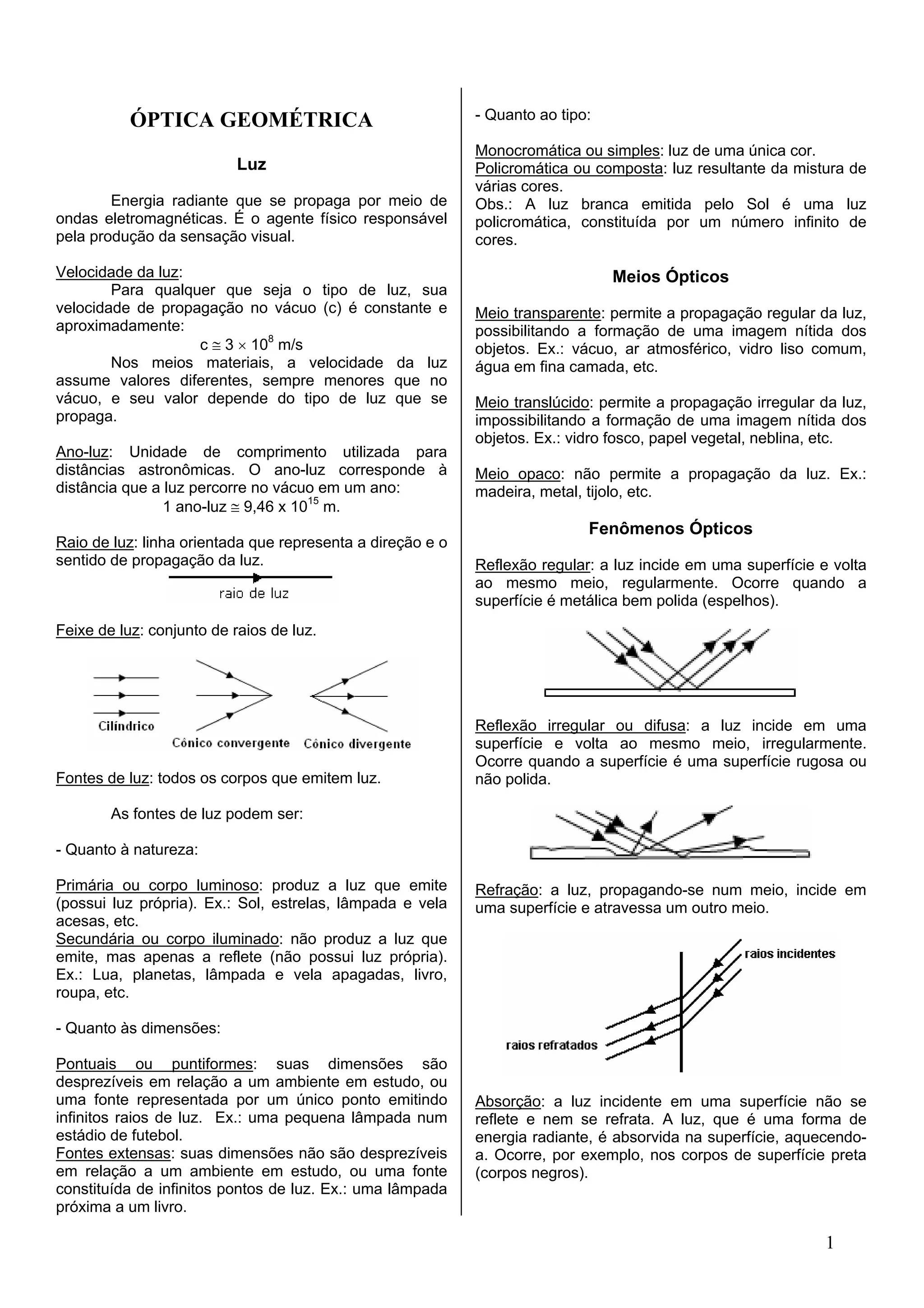 1) O documento discute os princípios básicos da óptica geométrica, incluindo a propagação retilínea da luz, reflexão, refração e formação de imagens por espelhos.
