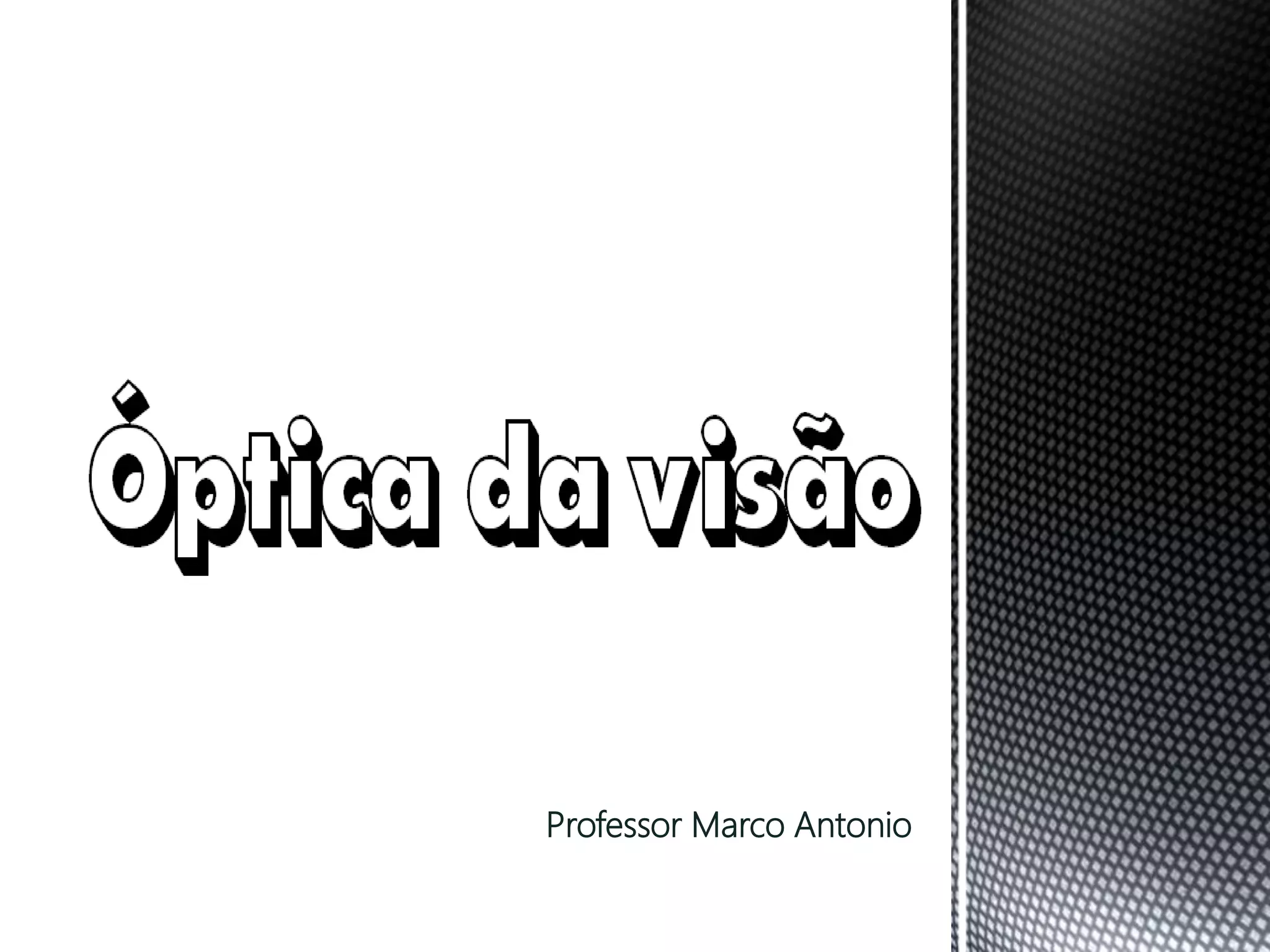 O documento discute a óptica da visão humana e defeitos visuais. Ele descreve os principais elementos do olho como a íris, cristalino e retina, e como eles formam imagens. Também explica defeitos como miopia, hipermetropia e astigmatismo, e como eles são corrigidos com lentes. Finalmente, apresenta exercícios sobre defeitos visuais e prescrição de lentes corretivas.