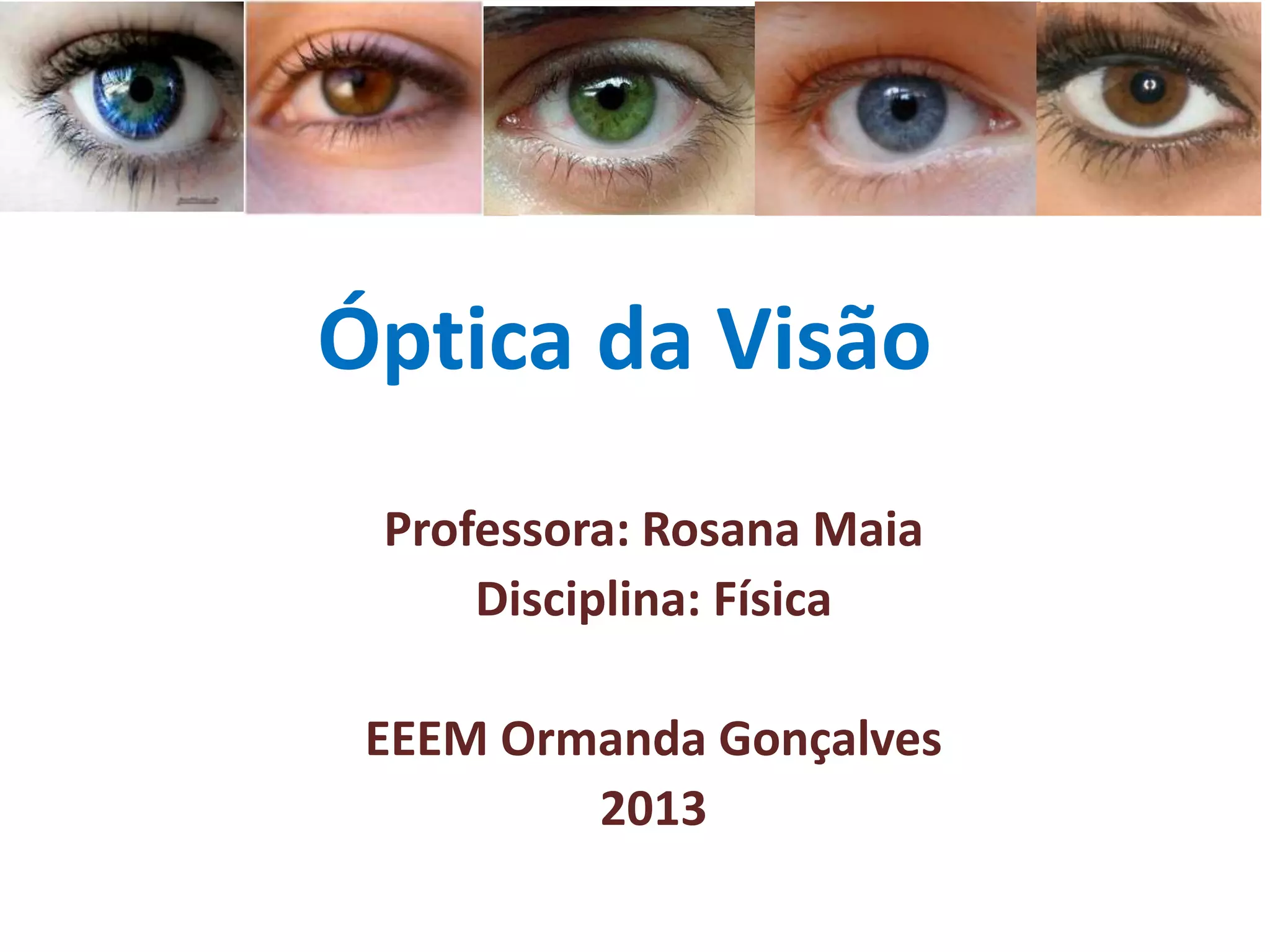 1) O documento descreve a anatomia e o funcionamento do olho humano, incluindo a formação de imagens na retina e os principais defeitos de visão como miopia, hipermetropia e presbiopia.