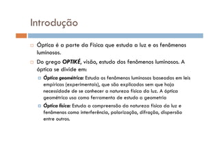 O documento apresenta uma introdução à óptica, definindo o que é óptica e dividindo-a em óptica geométrica e óptica física. Também aborda a natureza da luz, suas fontes, meios de propagação e fenômenos ópticos como reflexão, refração, absorção e dispersão.