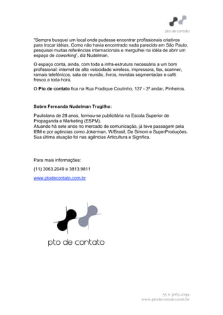 O documento descreve o Pto de Contato, um novo espaço de coworking inaugurado em Pinheiros, São Paulo, em outubro de 2008. O coworking permite que profissionais autônomos trabalhem juntos em um mesmo espaço, compartilhando ideias. O Pto de Contato oferece infraestrutura e um ambiente inspirador para estimular a criatividade dos profissionais que trabalham com comunicação.