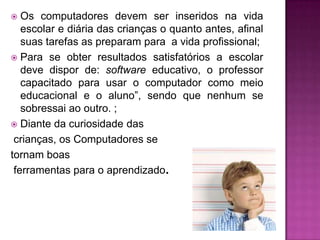 O documento discute a importância da introdução de computadores na educação desde a idade escolar, argumentando que eles podem melhorar o desempenho dos alunos, estimular a imaginação e a criatividade, e desenvolver habilidades psicológicas, sociais e morais. Também defende que os computadores podem promover a coesão social e familiar ao permitir novas formas de interação entre pais e filhos.