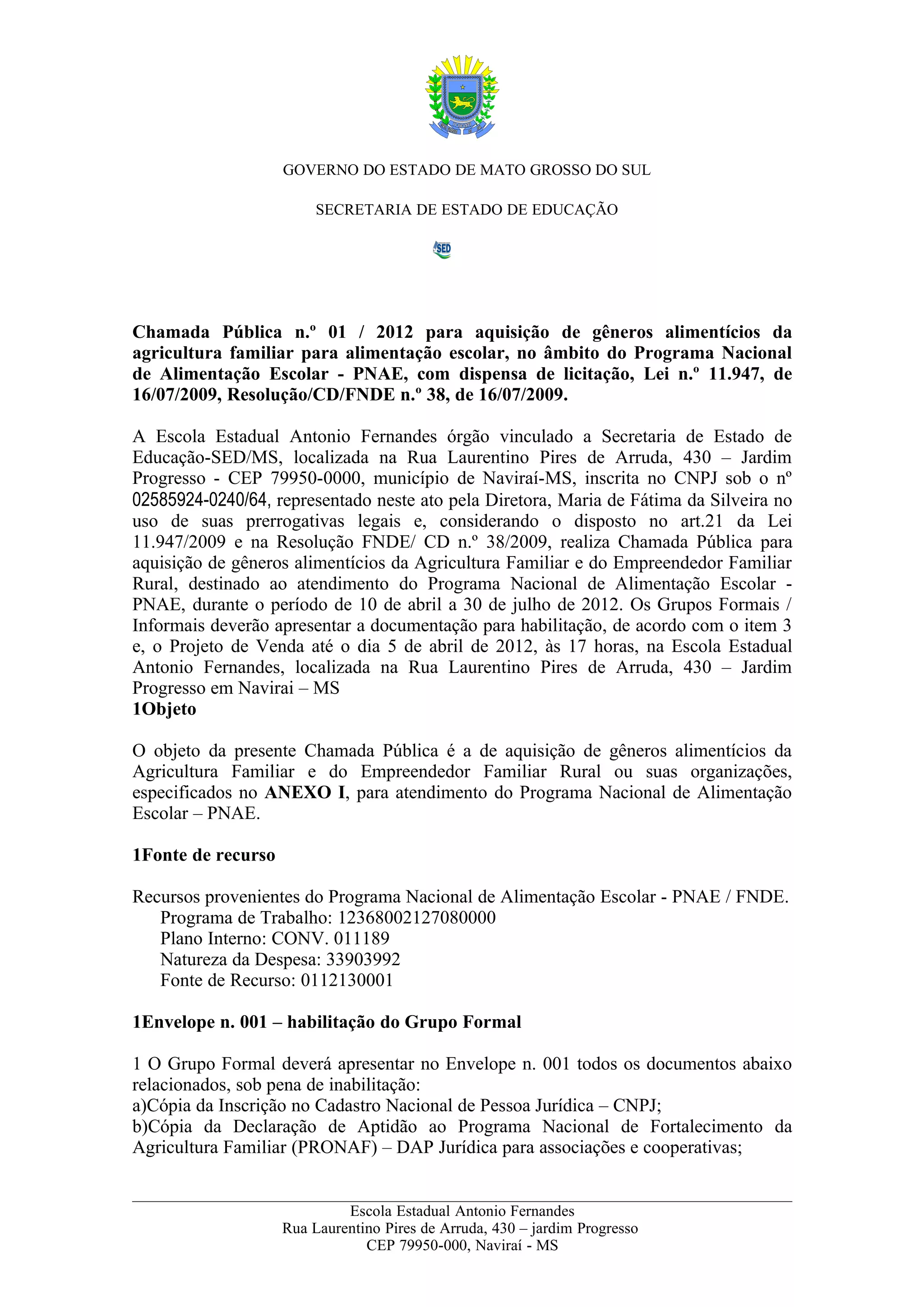Este documento anuncia uma chamada pública para aquisição de gêneros alimentícios da agricultura familiar para o Programa Nacional de Alimentação Escolar da Escola Estadual Antonio Fernandes em Naviraí, MS. Ele especifica os requisitos para habilitação de grupos formais e informais e detalha os procedimentos e prazos para apresentação de documentos, amostras e projetos de venda.