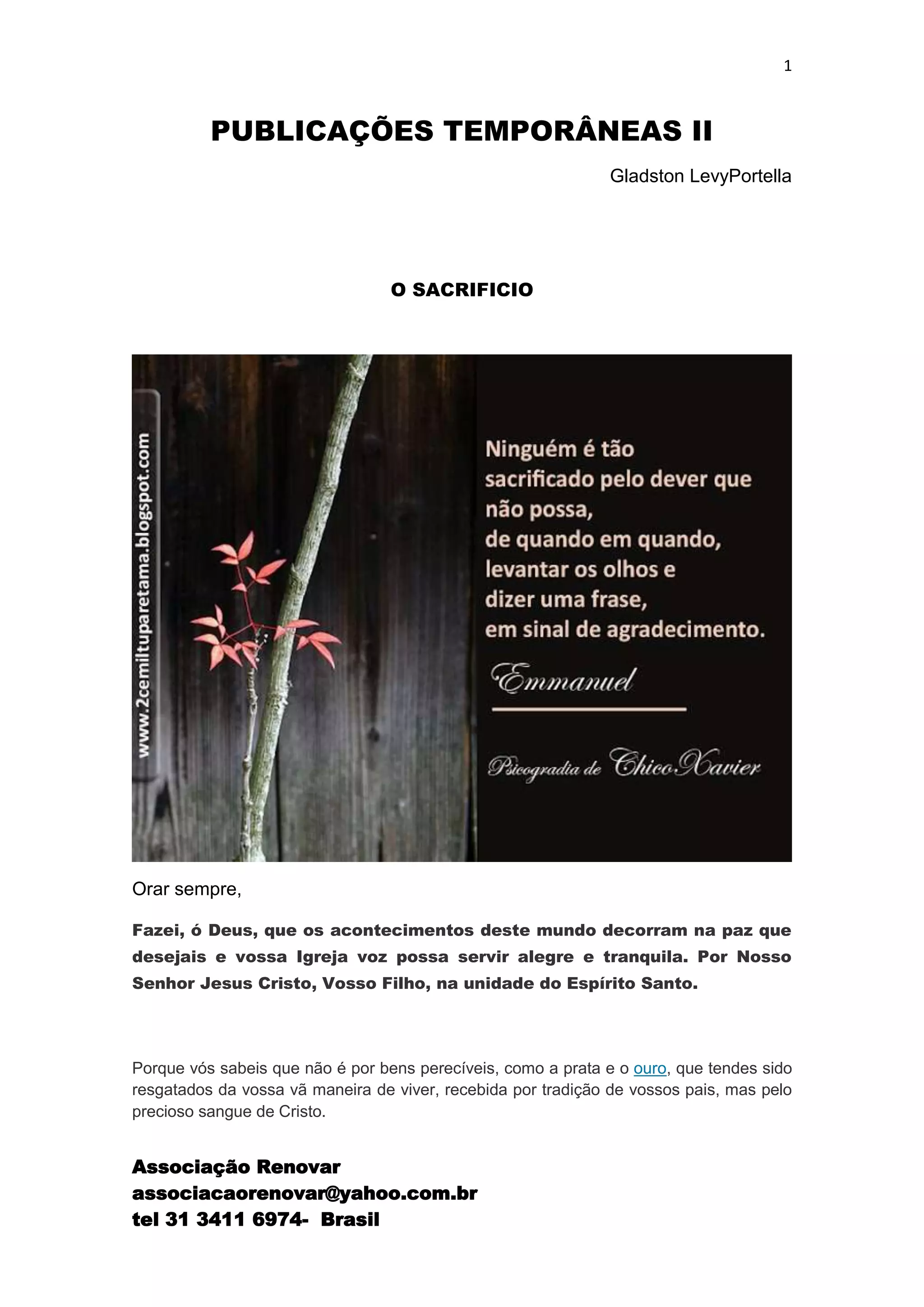 O documento discute temas religiosos como fé, esperança, amor e sacrifício. Também reflete sobre a natureza humana, educação, atitudes e busca por Deus.