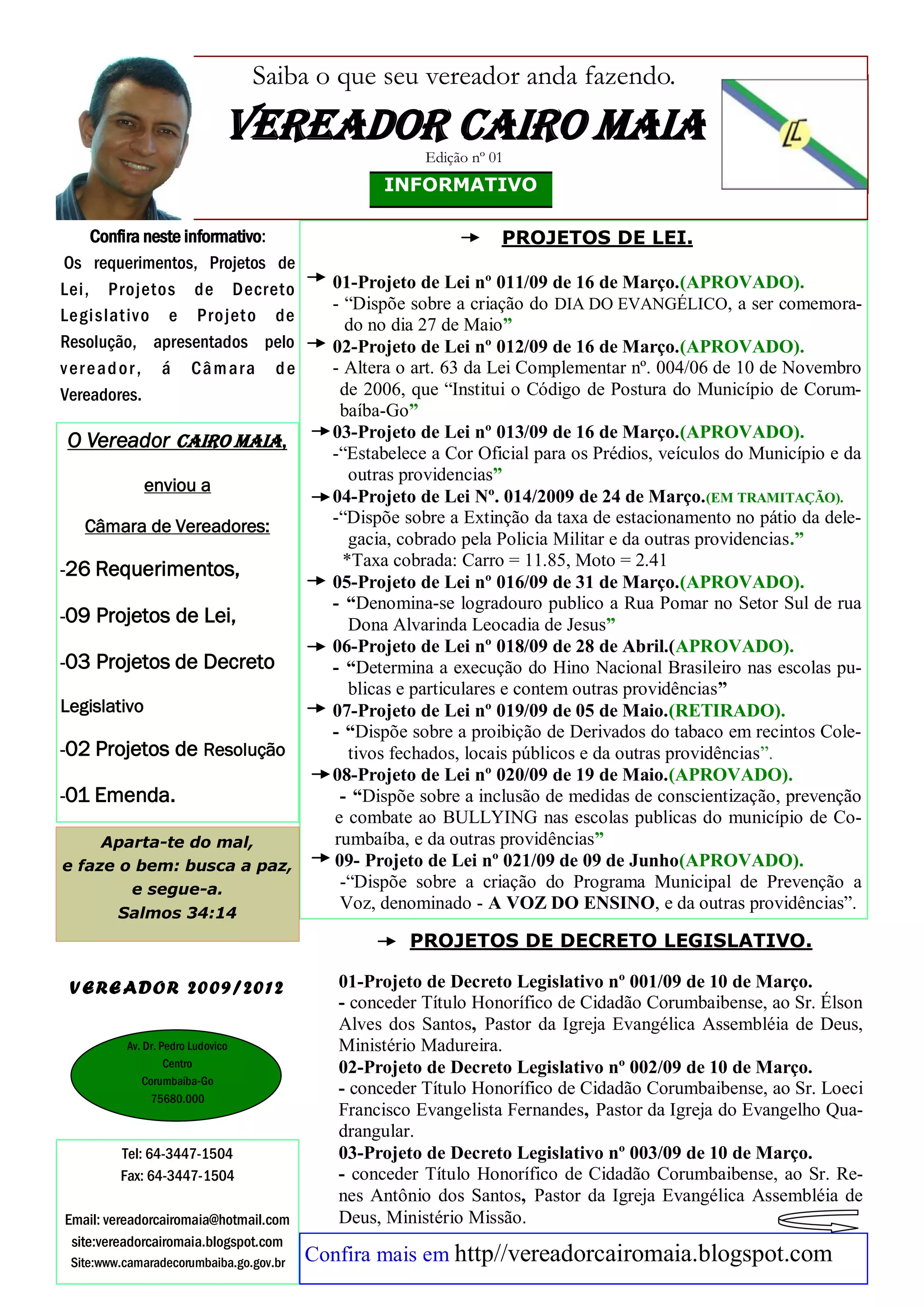 O documento resume os projetos de lei, decretos legislativos, requerimentos e emendas apresentados pelo vereador Cairo Maia à Câmara de Vereadores de Corumbaíba entre fevereiro e junho de 2009, incluindo nove projetos de lei aprovados sobre diversos temas e 26 requerimentos aprovados sobre melhorias para a cidade.