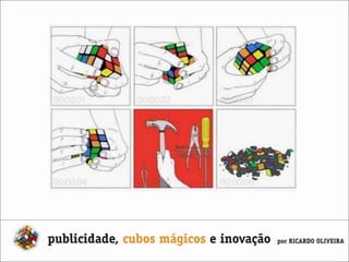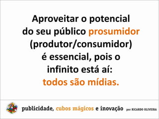 O documento apresenta um jovem cinefilo e nerd que explora a convergência de mídia e tecnologias digitais, abordando conceitos de design, colaboração e comunidade na era da informação. Ele discute a importância de criar experiências envolventes e a necessidade de um bom design que relacione o cliente com a marca, destacando a evolução da web de uma estrutura enciclopédica para uma participação interativa. O autor enfatiza que todos são mídias e que a inovação está na capacidade de antecipar o futuro ao eliminar o que não faz sentido.