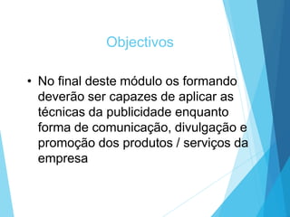 Este documento discute objetivos, tipos e conceitos de publicidade e promoção. Ele explica que o objetivo do módulo é capacitar os alunos a aplicar técnicas de publicidade como forma de comunicação, divulgação e promoção de produtos e serviços de uma empresa. Além disso, aborda conceitos como briefing publicitário, elaboração de mensagens, escolha de canais e avaliação de campanhas publicitárias.