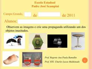 A Escola Estadual Padre José Scampini pediu aos alunos para observarem imagens e criarem uma propaganda utilizando um objeto inusitado, visando estimular a criatividade dos estudantes. A atividade foi conduzida pelos professores Ana Paula Ramalho e Charles Lucas Maldonado no ano de 2011.