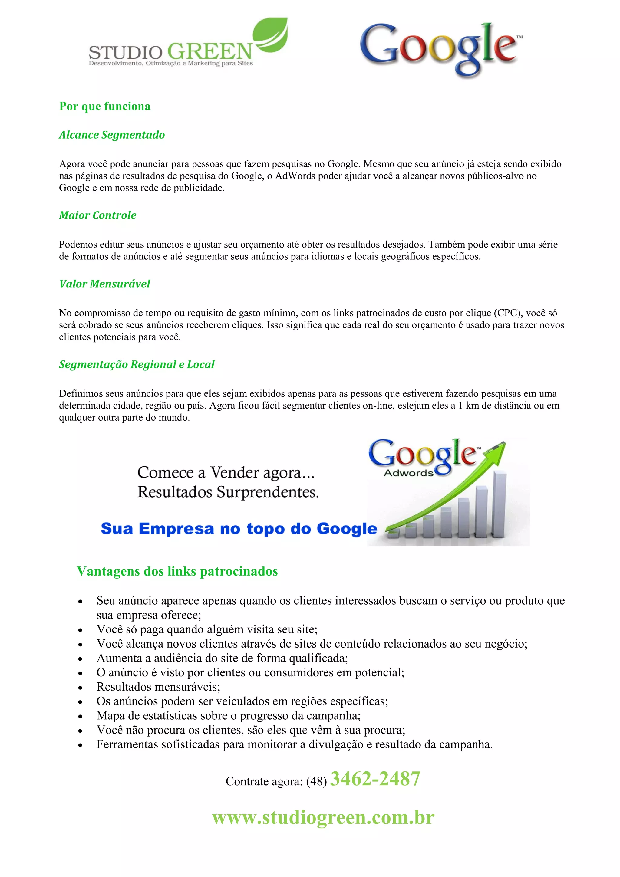 [1] O documento descreve os benefícios dos links patrocinados no Google AdWords, incluindo alcance segmentado para novos públicos-alvo, maior controle sobre anúncios e orçamento, e medição de valor com pagamento apenas por cliques; [2] Oferece segmentação regional e local para exibir anúncios em cidades, regiões ou países específicos; [3] Fornece uma lista de vantagens adicionais como anúncios relevantes, pagamento apenas por visitas ao site, aumento qualificado da audiência e resultados mensuráveis.