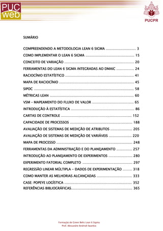 1) Formação de Green Belts em Lean Six Sigma, abordando conceitos como DMAIC e ferramentas estatísticas;