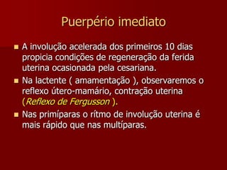 O documento discute o puerpério normal e a amamentação. Resume os principais pontos do puerpério, como a involução uterina e os lóquios no pós-parto imediato. Também destaca as vantagens da amamentação exclusiva até 6 meses como padrão ouro, e sua manutenção por até 2 anos com introdução adequada de alimentos complementares.
